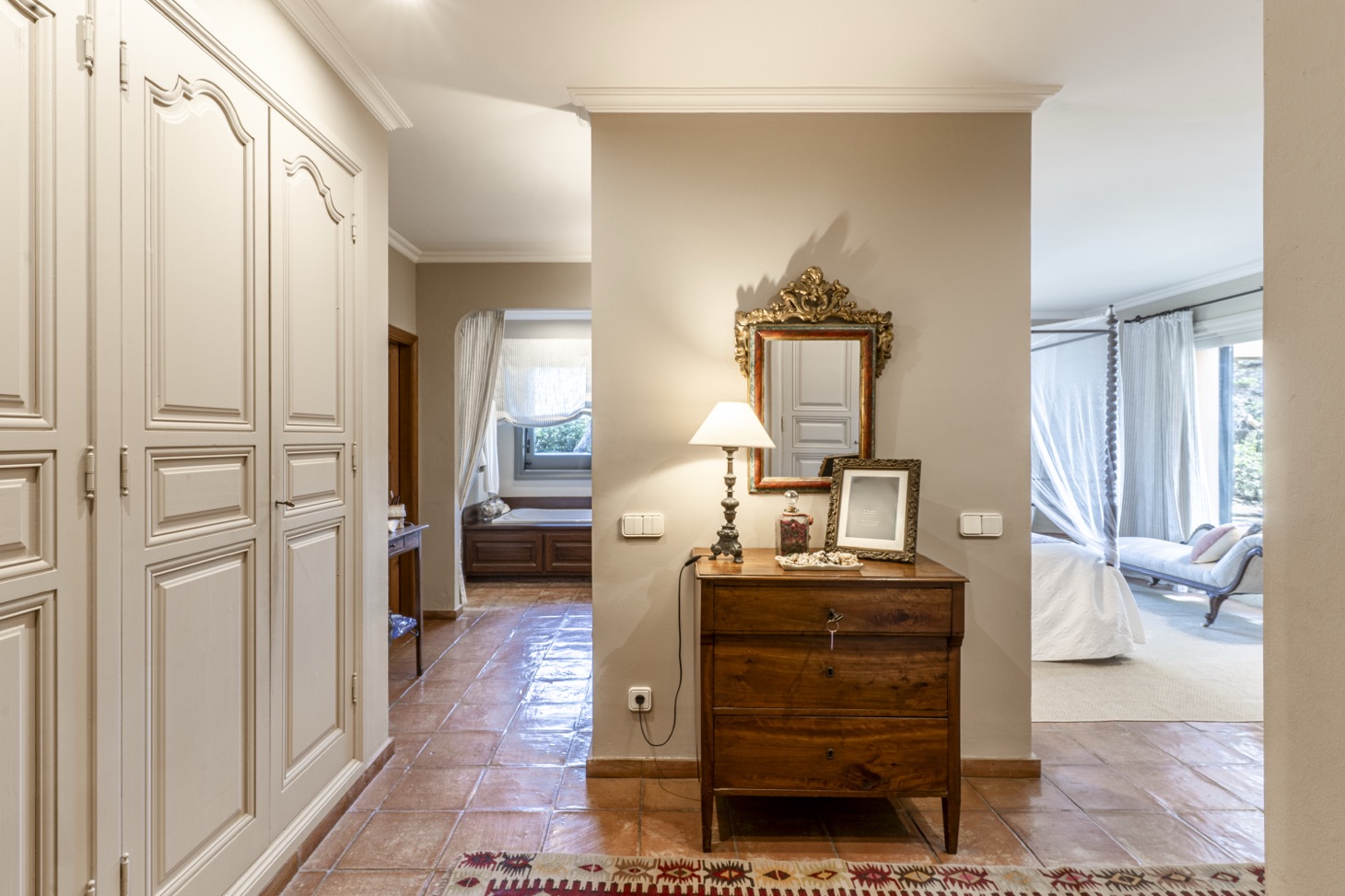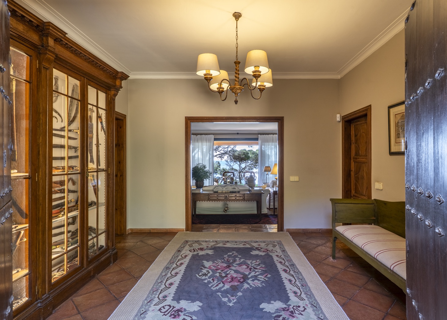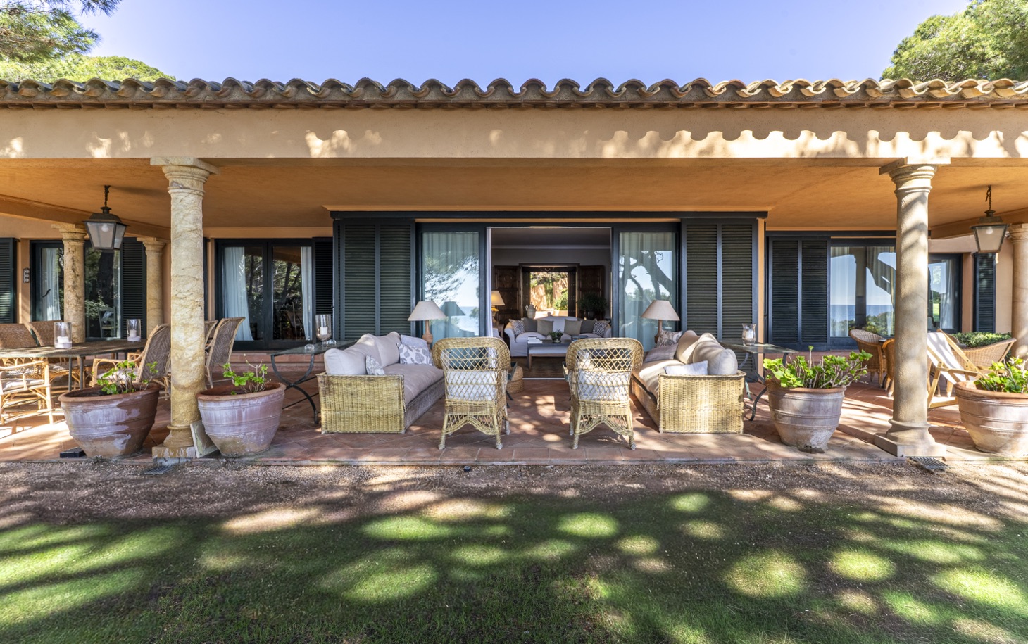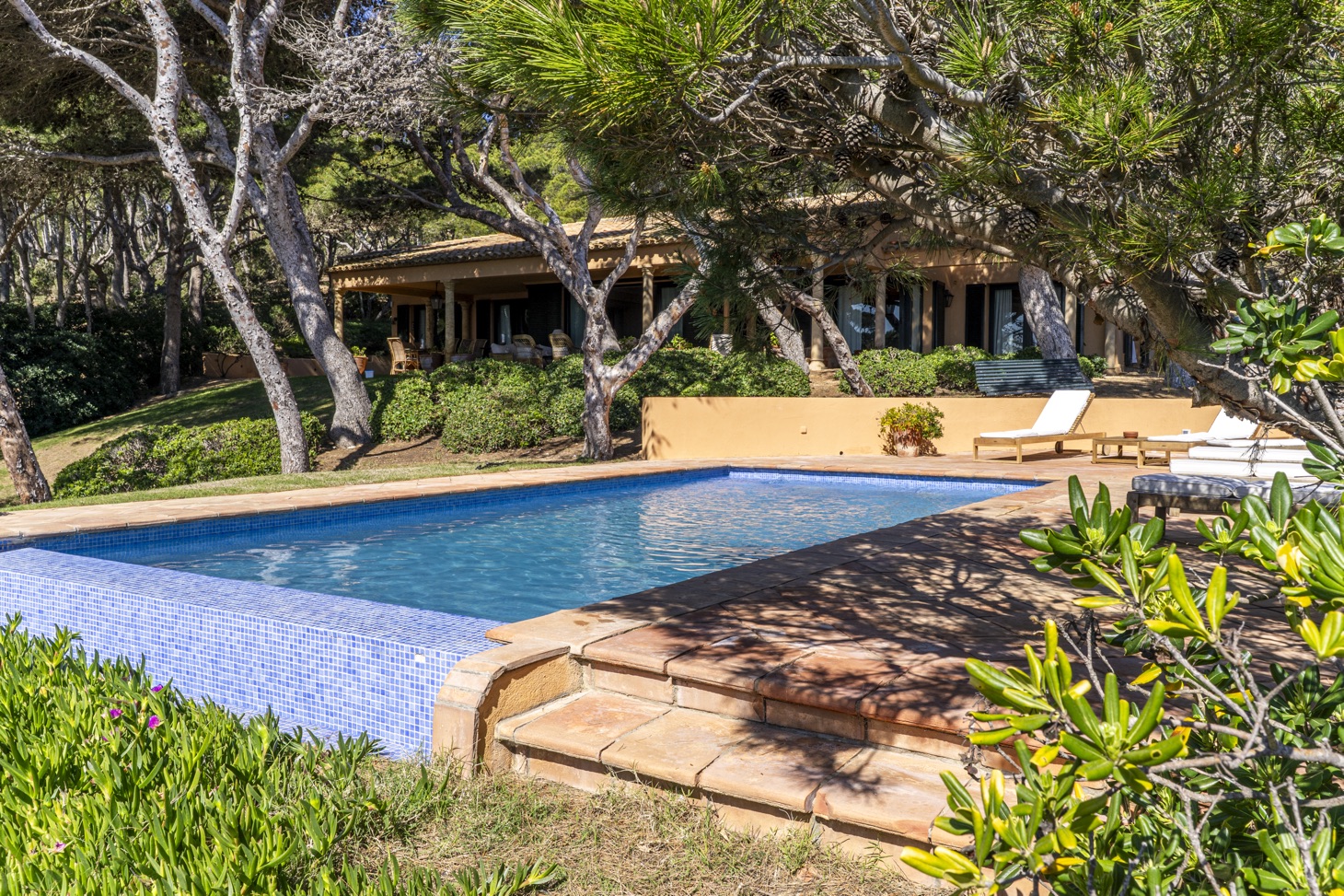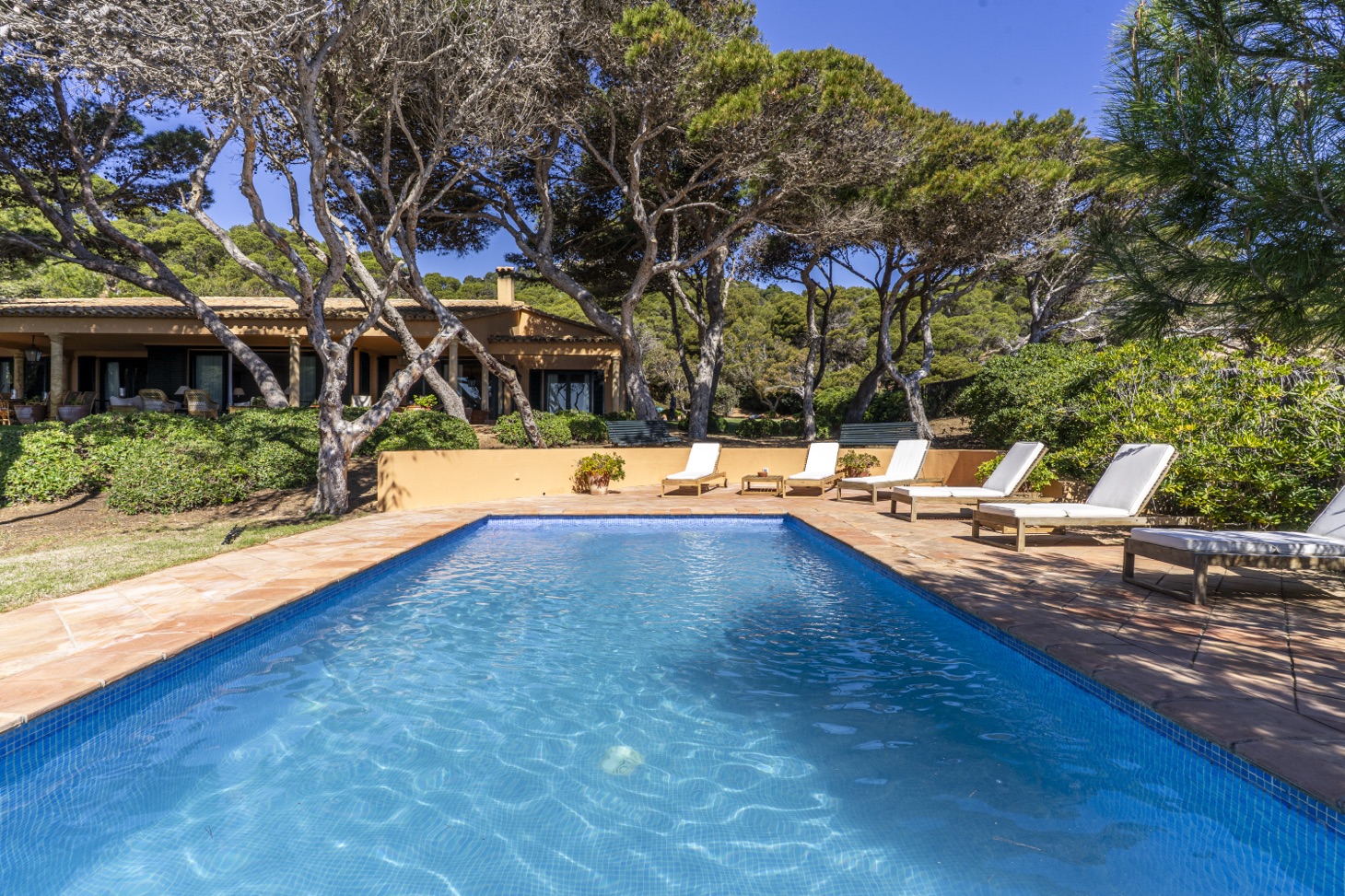 The living area features a cozy lounge with a fireplace, ideal for relaxing at any time of the year, with direct access to the outdoor spaces and landscaped gardens. The exterior areas, including the terrace, garden, and swimming pool, become the heart of the home, perfect for enjoying the Mediterranean climate, dining outdoors, or unwinding with sea views.